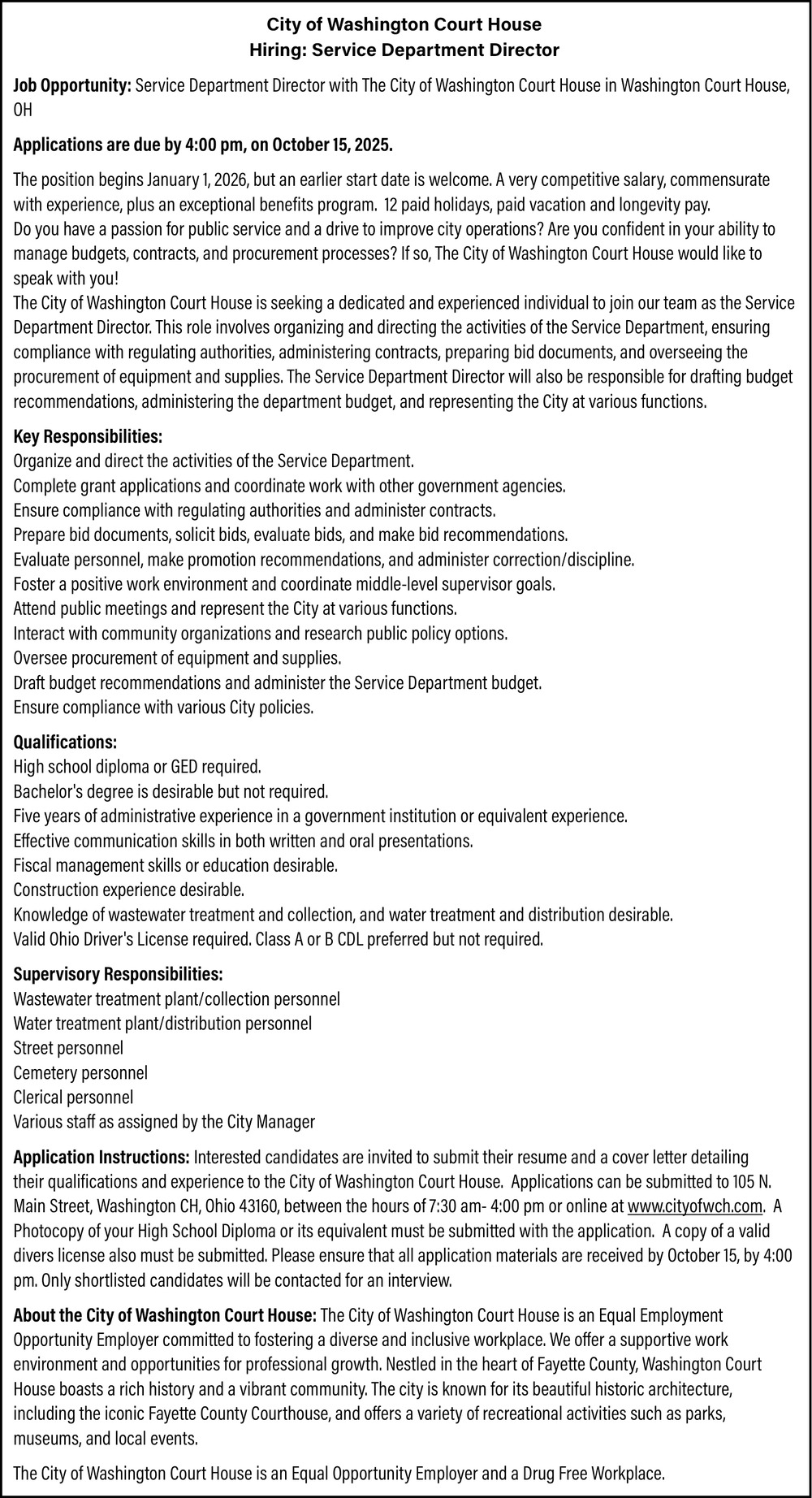 Oct 03, 2025. City of Washington Court House Jobs Ads from Xenia Daily Gazette