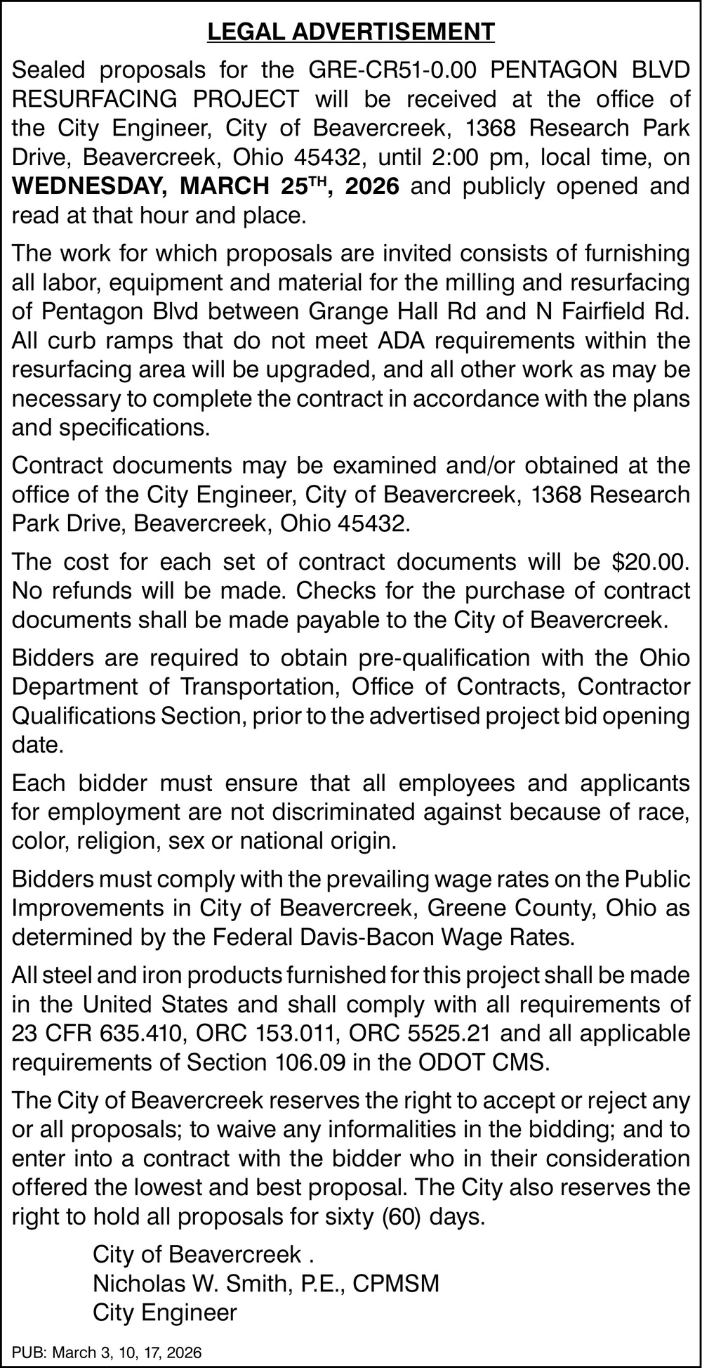 Mar 03, 2026. City of Beavercreek Public Notice Ads from Xenia Daily Gazette